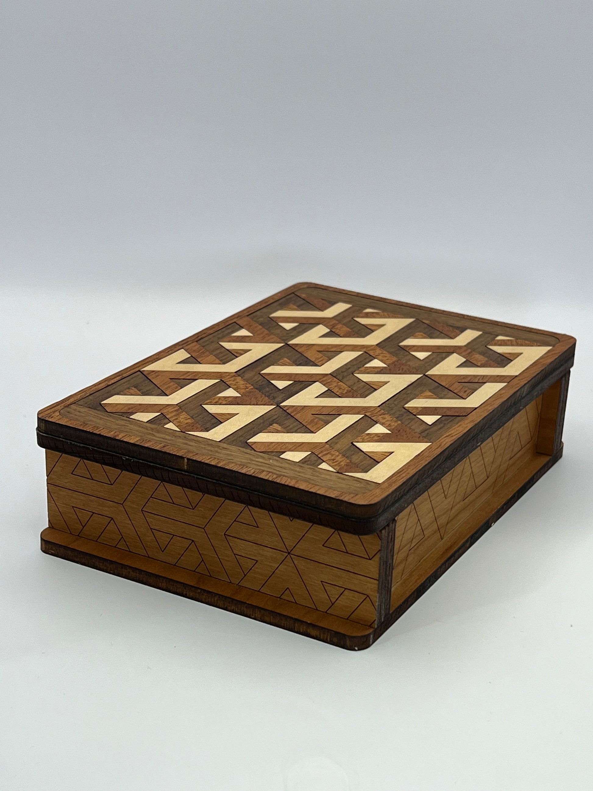 Elevate your storage with our elegant box, complete with a stunning lid featuring a geometric masterpiece in mahogany, maple, cherry, and walnut. Choose between one or two luxurious compartments for all your organizing needs.